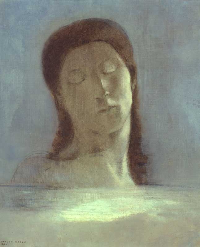 Odilon Redon réalise la version originale des Yeux Clos en 1890 (d’autres versions verront le jour plus tard), à un moment où le peintre originaire de Bordeaux amorce un tournant décisif dans sa carrière. Jusqu’alors focalisé sur des travaux principalement exécutés au fusain, Redon marque en effet ici, via cette toile qui devra devenir bientôt l’une des figures pionnières du symbolisme pictural, son passage primordial du noir à la couleur.