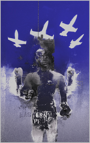 L’homme noir (figure récurrente chez l’artiste de Bristol, ancien très grand port négrier, jusqu’à l’abolition de l’esclave en Grande-Bretagne en 1807), les avions (empruntés à Basquiat, l’une des influences revendiquées de 3D), le visage désespéré (les sourires sont rares dans le monde visuel de 3D, au moins autant que dans la musique de Massive Attack…) : ce sont les icônes traditionnelles de l’artiste britannique que l’on retrouve ici, et une réalisation quasi prophétique que l’on aurait pu croire directement destiné à celui qui a finalement eu la chance de le récupérer à son profit. Mélissa Chemam, spécialiste, et cela tombe bien, autant de la géopolitique de l’Afrique contemporaine que de la scène artistique de Bristol :